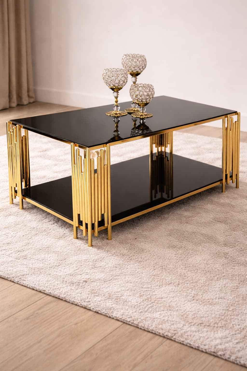 Kare Evol, gold ton metal ayak tasarımı ve siyah cam görünümüyle salonunuza modern bir dokunuş katan dikdörtgen orta sehpa modelidir. Alt raflı/çift katlı yapısı sayesinde günlük kullanımda daha fazla alan sunar.